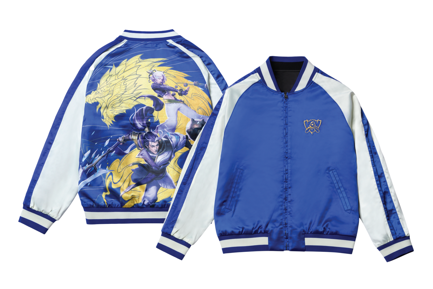 リバーシブル仕様のスカジャンで、表面はWorldsカラーのブルー×ホワイト。背面には「シン・ジャオ」と「ユナラ」が描かれた印象的なビジュアル。